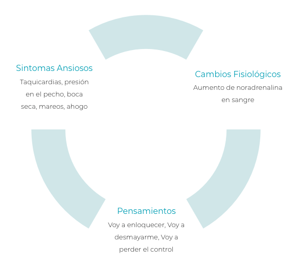 A nivel cognitivo la ansiedad se caracteriza por sentimientos de miedo intenso, falta de control sobre uno mismo y sobre el futuro, inseguridad, un estado de alerta constante y una situación de indefensión: no controlamos lo que antes si controlábamos. Por nuestra cabeza pasan pensamientos perturbadores como “me estoy volviendo loco”, “me voy a desmayar”, “podría hacerme daño”, “tengo que comprobar esto”, “estoy perdiendo el control”, “seguro que los demás notan que algo raro me pasa” entre otros. Todos estos pensamientos de carácter catastrófico crean un círculo vicioso la fisiología de nuestro cuerpo y nuestra percepción de los síntomas manteniendo así la ansiedad.