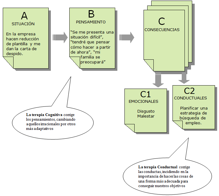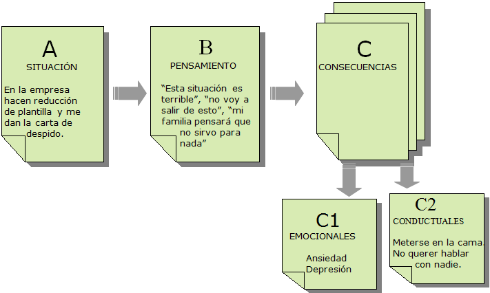 El Señor Y está interpretando una situación que es muy desagradable (que le echen de la empresa) como algo terrible, que no va a poder solucionar, y piensa lo que su familia dirá de él (B). Es fácil que de un pensamiento como éste se deriven toda una serie de síntomas ansiosos y depresivos (C1) que conduzcan a la persona a la inmovilización (C2).