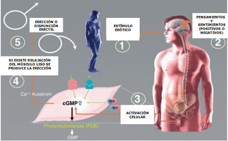 Esta es la base de funcionamiento del sildenafilo (VIAGRA) o del tadaláfilo (Cialis). Es un inhibidor de la fosfodiesterasa que facilita la relajación de los músculos lisos y en consecuencia facilita la entrada de sangre en el pene.