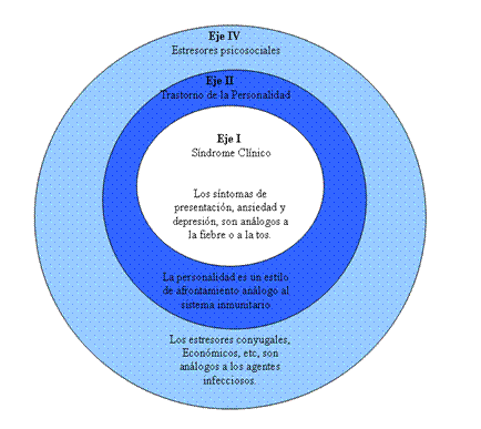 En el DSM (Manual diagnóstico y estadístico de los trastornos mentales) los trastornos se agrupan en función de un modelo multiaxial. Multiaxial significa varios ejes. Este modelo recoge la necesidad de agrupar los distintos síntomas y características de la personalidad de un paciente determinado a fin de poder definir un cuadro que refleje el patrón completo de funcionamiento de esa persona. El modelo multiaxial se divide en 5 ejes.