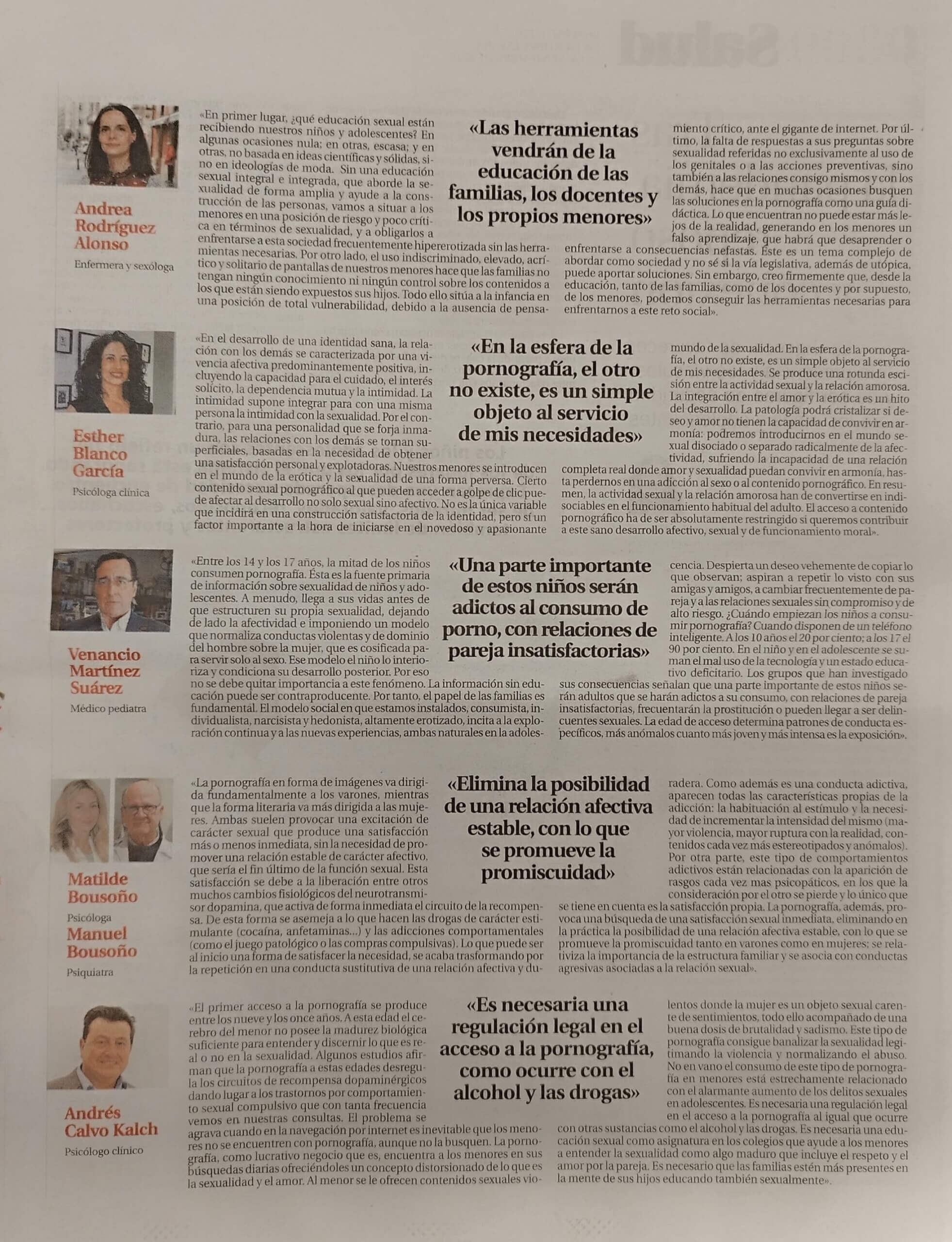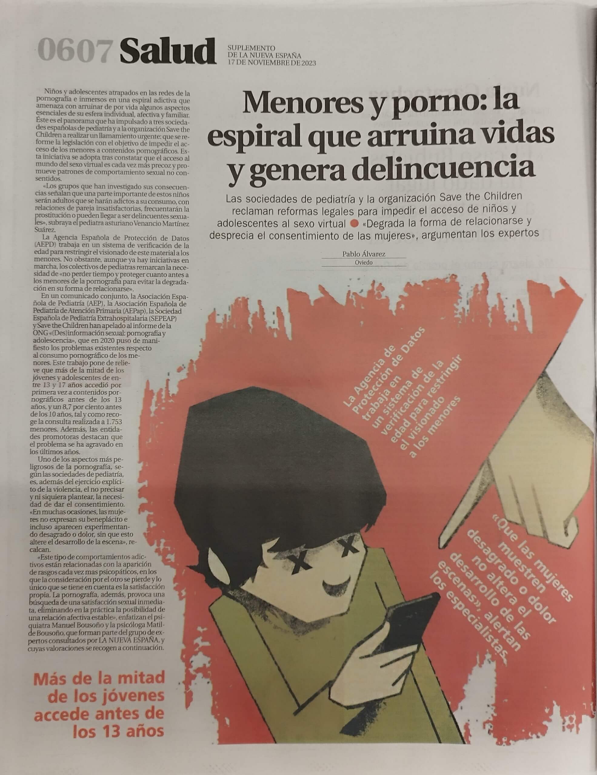 El viernes 17 de Noviembre, La Nueva España en su edición impresa y online, entrevista a Esther Blanco Garcia y Andrés Calvo Kalch sobre el acceso a la pornografía de los menores y sus consecuencias.
