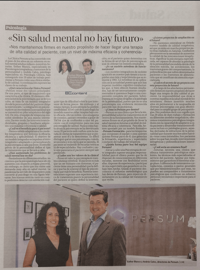 Esther Blanco y Andrés Calvo, directores de la Clínica Persum, participaron en la edición Especial Salud con un artículo donde presentan el proceder de la Clínica Persum en su día a día, el mantenimiento de la calidad de las intervenciones y las terapias que se llevan a cabo.